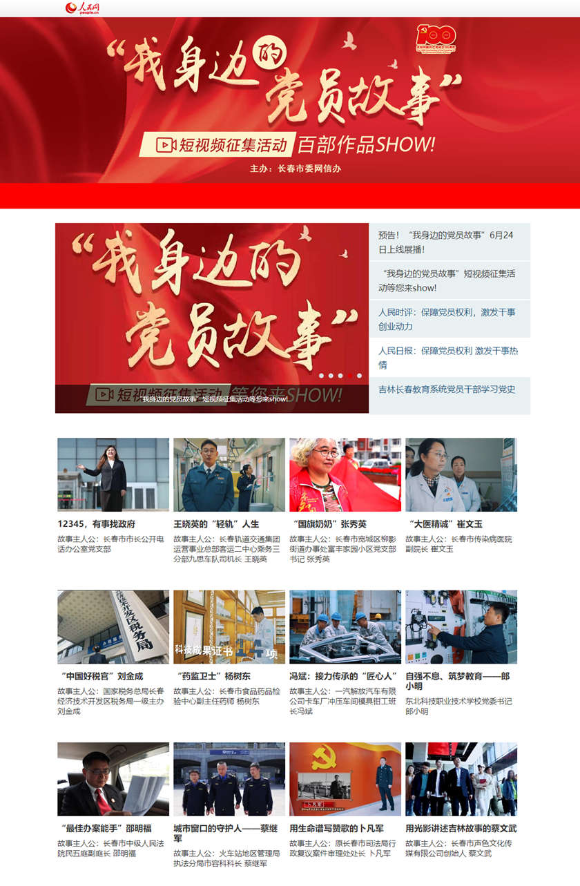 百部優(yōu)秀短視頻于6月24日開始在全網(wǎng)全平臺展播,每天推出三個優(yōu)秀作品。人民網(wǎng)、新華網(wǎng)、鳳凰網(wǎng)、學(xué)習(xí)強國、華人頭條、一點資訊、中國吉林網(wǎng)、ZAKER吉林和長春本地網(wǎng)絡(luò)媒體紛紛建專題同推廣,全市LED大屏同步播放,為慶祝建黨百年營造濃厚氛圍。截至7月8日,僅人民網(wǎng)專題閱讀量就達到530余萬次。白山松水之間、勞動生產(chǎn)一線、平凡崗位之中,廣大黨員、黨組織用專業(yè)和行動助力長春經(jīng)濟發(fā)展、投身長春建設(shè);用愛心和奉獻關(guān)心群眾生活;用熱血和赤誠書寫奮斗故事,讓黨的精神閃耀傳承。