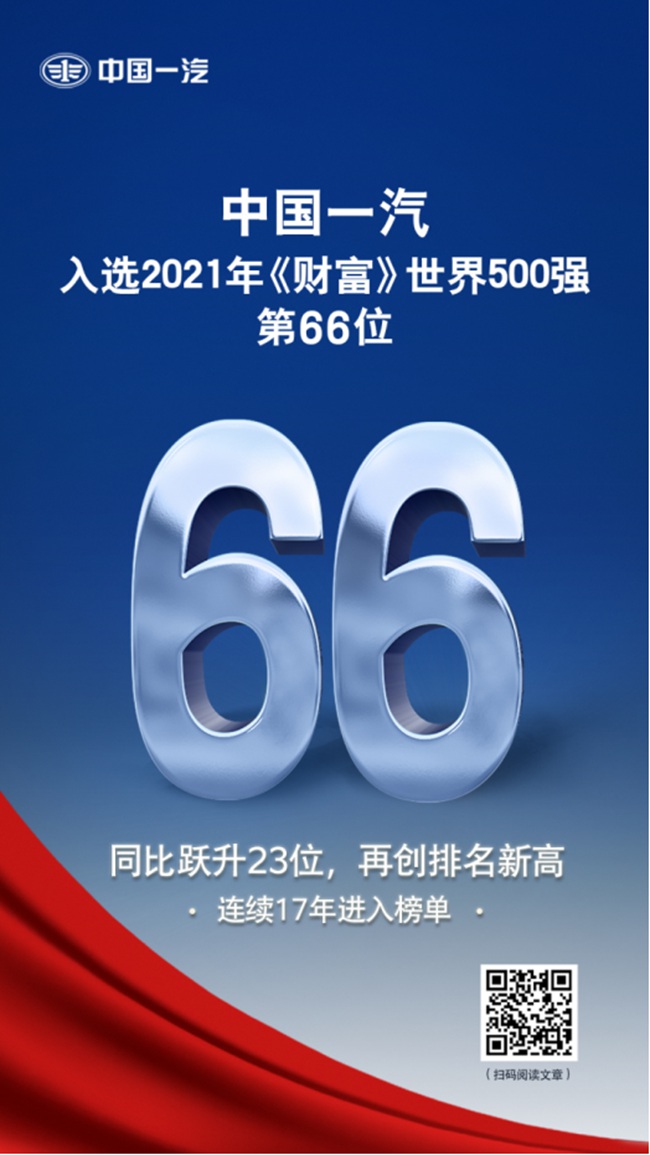 中國一汽2021世界500強榜單排名創新高 名列第66位