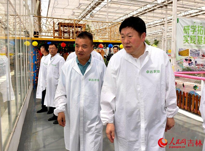 吉林市委書記賀志亮(右一)在永吉縣卓遠高科技農業生態園調研現代農業建設和發展情況