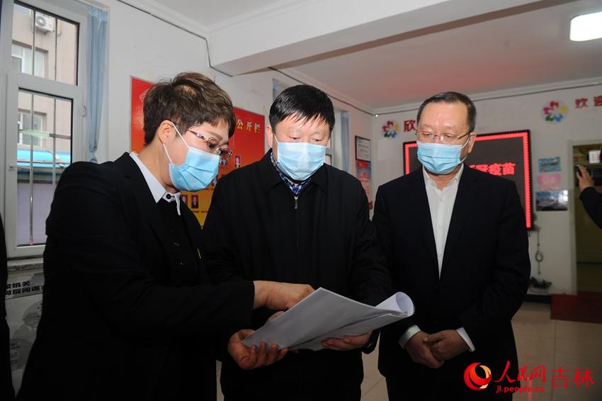 吉林市委書記賀志亮(中)在昌邑區東局子街道欣炭社區,實地督導檢查疫情防控工作開展情況