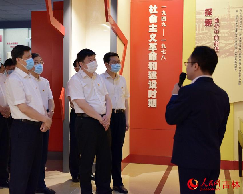 吉林市委書記賀志亮(中)、市委副書記、市長王路(左三)等市領導參觀“奮斗百年路 起航新征程——吉林市慶祝中國共產黨成立100周年主題展覽”
