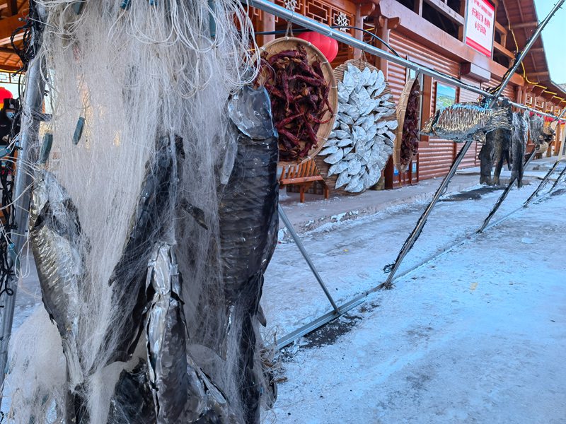 在查干湖年貨、非遺產品展銷大集上,年貨產品琳瑯滿目,非遺“鐵魚”為冬捕“添彩”。“大家看到的魚、辣椒、餃子等都是鐵藝作品,寓意年年有魚、紅紅火火,也希望能為查干湖冬捕‘添彩’。”吉林省鐵制品制作技藝非遺傳承人隋進才說。