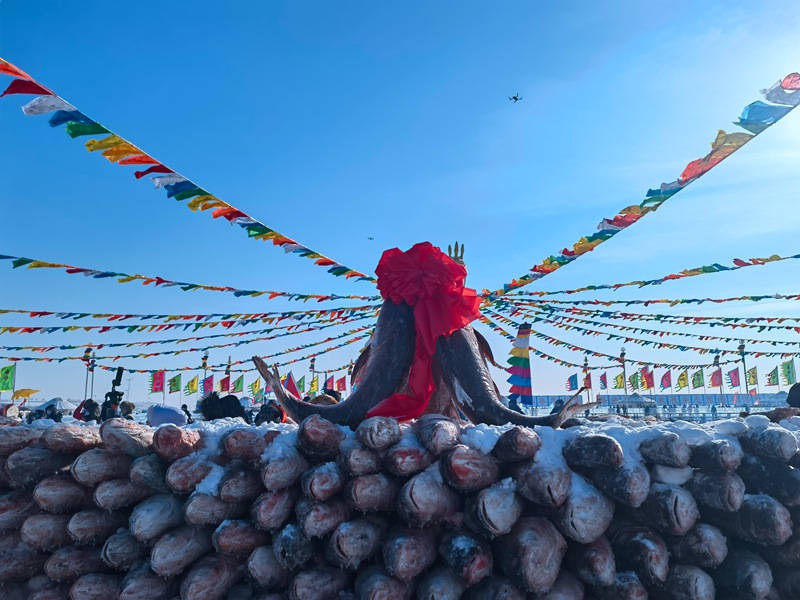 冬捕,在厚厚的冰面上鑿開幾個大洞,在“魚把頭”的號子聲指揮下,千米漁網被拉起,成堆的鮮魚一躍而出,在冰面上騰躍起舞!延續千年的冬捕習俗展示了傳統的漁獵文化,也讓查干湖的冬天與眾不同。