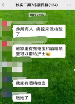 信息一發出,7棟居民紛紛伸出援手。“我家有酒精噴壺,送她了。”“我家有充電寶。”……在居民的熱心幫助下,核酸檢測工作開始了。