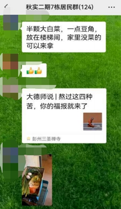 “半顆大白菜和一點豆角放在樓梯間了,家里沒菜的可來拿。”“剛生好的綠豆芽,誰需要?”“我公司開超市,有蔬菜、水果、生活用品,如果菜不夠,我可以幫著聯系統一送過來”……食材緊缺,他們互相幫忙,克服困難。