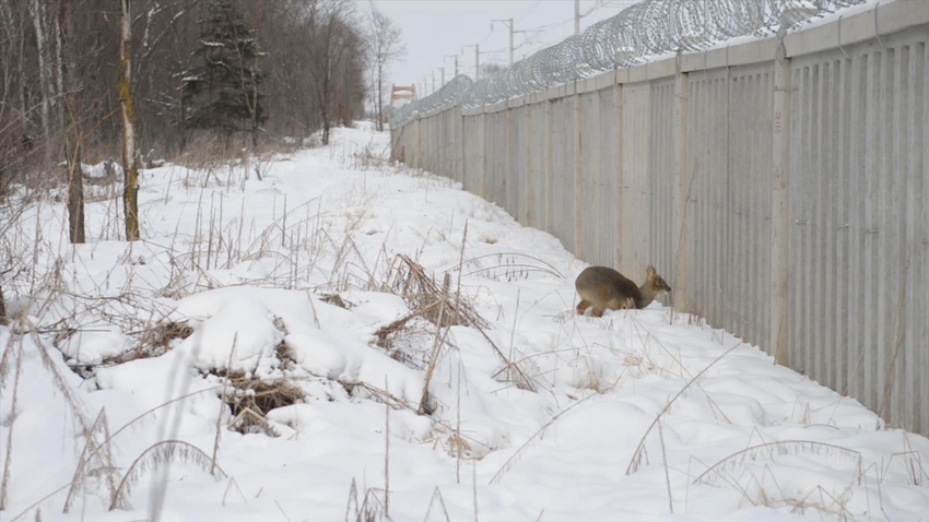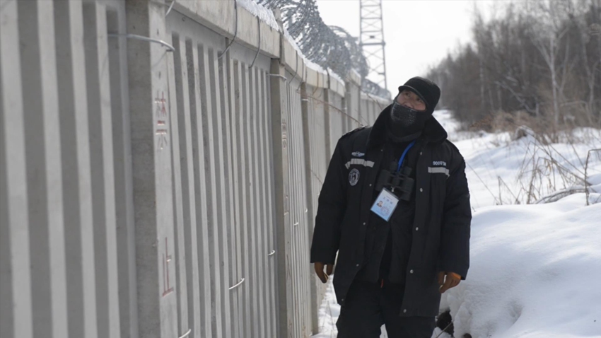 14時15分,越往前走林越密,雪地上依稀可見零亂的動物腳印。“這里經常有狍子、野豬、野兔等動物出沒,這兒得重點檢查封閉網立柱和封閉網有沒有被撞松撞壞情況。”李國君邊說邊檢查,恰在這時不遠處一只小狍子聽到響聲由封閉網旁向密林深處狂奔而去。“年三十傍晚,有4只狍子來到8號崗亭,我出去攆了幾次才離去。”