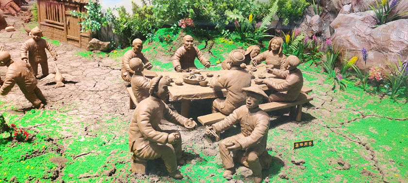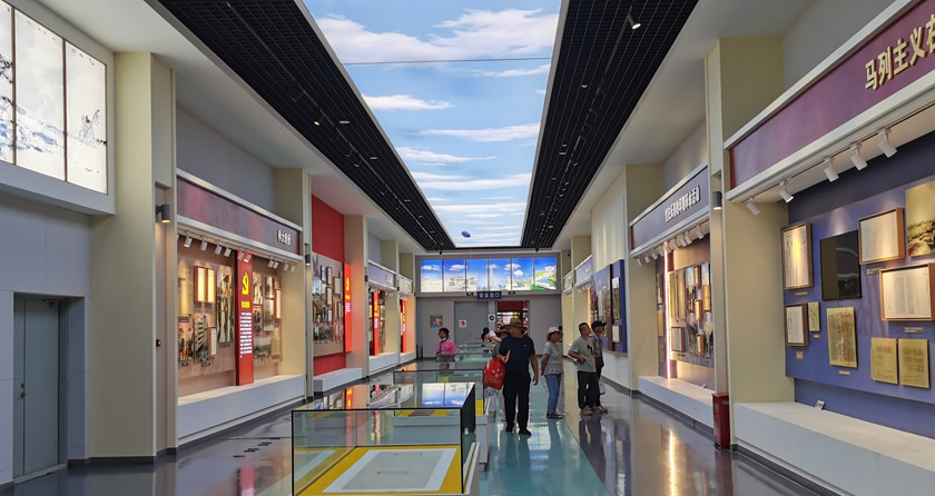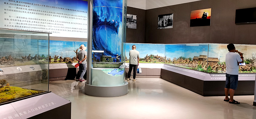 走過描有彩繪門神的大門,便進入到展廳內(nèi)部:關(guān)東文明史展區(qū)、闖關(guān)東歷史展區(qū)、關(guān)東特色民居展區(qū)、關(guān)東農(nóng)耕風情展區(qū)、關(guān)東特色文化展區(qū)、《蓽路藍縷 初心如磐——慶祝中國共產(chǎn)黨成立100周年展覽》,一段段歷史逐漸呈現(xiàn)。