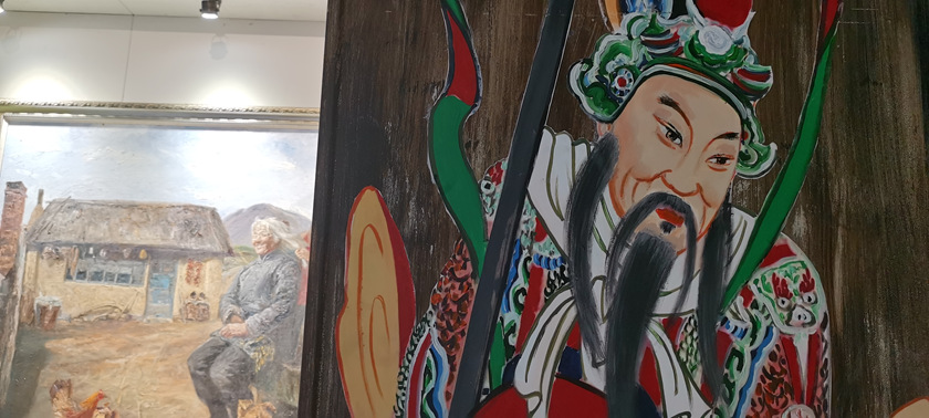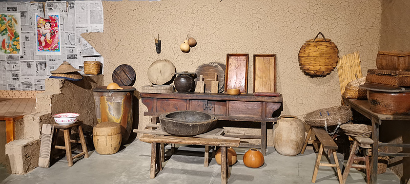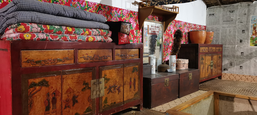 墻上的12幅圖片展示的是“關(guān)東十二大怪”:黃土打墻墻不倒、野獸骨頭欻起來、窗戶紙糊在外、姑娘叼個大煙袋、大缸小缸漬酸菜、養(yǎng)活孩子吊起來、馬拉爬犁跑得快、小伙翻墻狗不咬、冬包豆包講鬼怪、狗皮帽子頭上戴、黃土房子籬笆寨、外出要把糞筐帶。