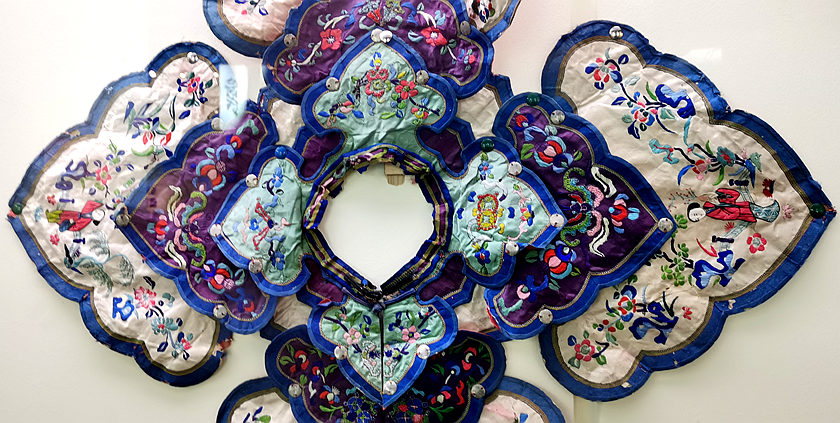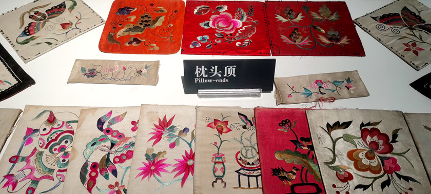 滿族刺繡實用性很強,在日常生活用品和服飾上隨處可見,其中以枕頭頂刺繡最為精美。傳說,滿族先民在他們的故鄉(xiāng)——東北的白山黑水生活時,使用的枕頭是圓木制成的。起初每家人都枕在一棵圓木上,后來覺得這樣不方便,一個人翻身,全家人都要被驚醒,以后他們就將長圓木鋸成短骨碌,各枕各的。枕頭頂多用紅、藍、黃、白滿族八旗的顏色為基調(diào),構(gòu)圖典雅,色彩艷麗、和諧。