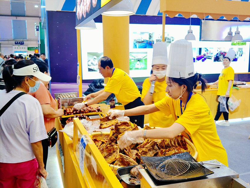 走向吉林省本方農業股份有限公司的野蠻香長白山散養黑豬肉展位,本原肉香味兒滿面而來,“這是我們參展農博會的第7個年頭,我們此次展銷的主產品是小鮮肉丸子、小鮮肉香腸和新款的爆汁烤腸,除了現場銷售,我們還在展館內同步進行電商直播,產品銷往四川、廣東、江蘇、河南等省外市場。”本方農業野蠻香長白山散養黑豬肉總經理王瑛輝說。