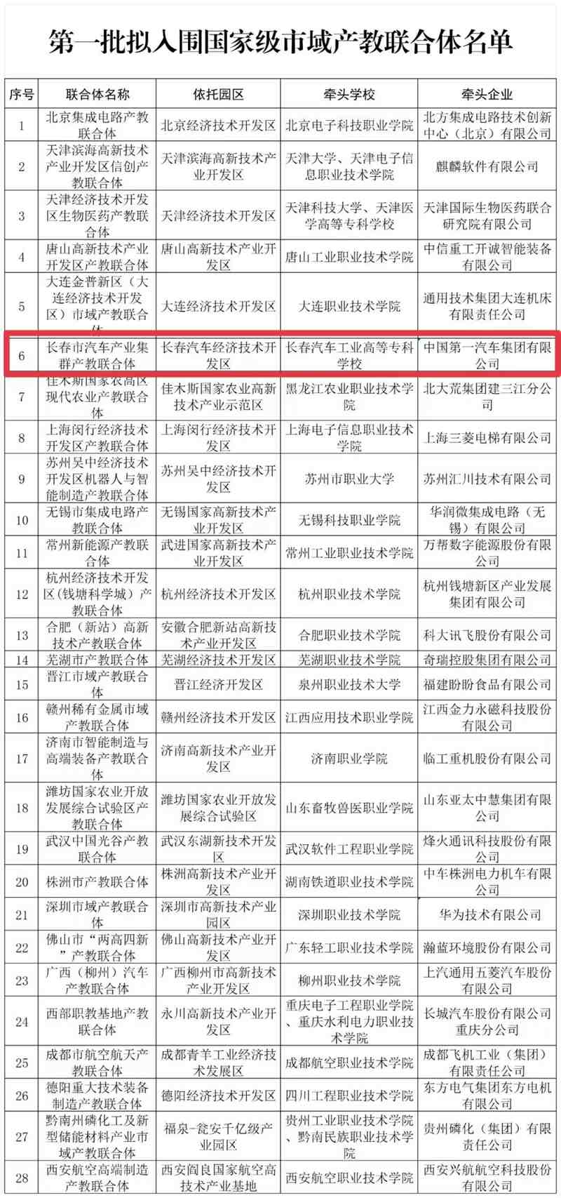 其中,長春市汽車產業集群產教聯合體成功入圍,成為吉林省唯一一家入圍單位。長春市汽車產業集群產教聯合體依托長春汽車經濟技術開發區,由中國第一汽車集團有限公司(企業)和長春汽車工業高等專科學校(學校)牽頭負責。