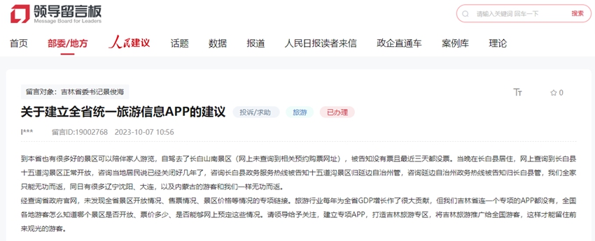 “旅游行業每年為全省GDP增長作了很大貢獻,但我們吉林省連一個專項的APP都沒有,全國各地游客怎么知道哪個景區是否開放、票價多少、是否能夠網上預訂這些情況。請領導給予關注,建立專項APP,打造吉林旅游專區,將吉林旅游推廣給全國游客,這樣才能留住前來觀光的游客?!本W友在留言中寫道。