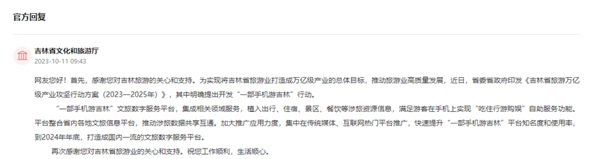 收到留言后,吉林省文旅廳回復表示,為實現將吉林省旅游業打造成萬億級產業的總體目標,推動旅游業高質量發展,近日,吉林省委省政府印發《吉林省旅游萬億級產業攻堅行動方案(2023—2025年)》,其中明確提出開發“一部手機游吉林”文旅數字服務平臺的行動。這與網友的建議不謀而合。