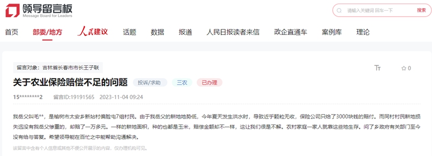 人民網長春11月13日電 (記者王海躍)近日,吉林省榆樹市網友在“領導留言板”給長春市市長留言,反映農業保險賠償不足的問題。