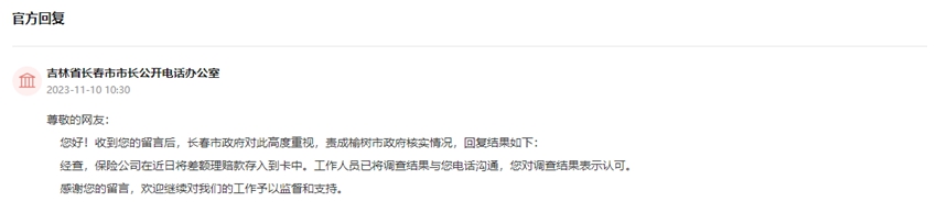 收到留言后,長春市政府對此高度重視,責成榆樹市政府核實情況。經查,保險公司在近日將差額理賠款存入到卡中。