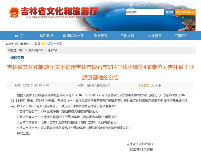 根據(jù)《國家工業(yè)旅游示范基地規(guī)范與評價》(LB/T 067-2017)與《吉林省工業(yè)旅游基地管理辦法(試行)》(吉文旅發(fā)〔2022〕384號)要求,經過企業(yè)申請、有關市(州)文化和旅游行政管理部門初審推薦,吉林省文化和旅游廳組織專家按程序開展綜合評定,并于2023年11月10日完成公示,確定吉林市磐石市:914 三線小鎮(zhèn)(磐石鑄誠無縫鋼管有限公司);通化市集安市:吉林麥吉翁酒業(yè)工業(yè)旅游基地(吉林麥吉翁酒業(yè)有限公司);白城市鎮(zhèn)賚縣:飛鶴(吉林)旅游觀光基地(飛鶴(吉林)乳品有限公司);延邊州延吉市:延邊韓食府民俗食品工業(yè)旅游基地(延邊韓食府民俗食品有限公司)為吉林省工業(yè)旅游基地。
