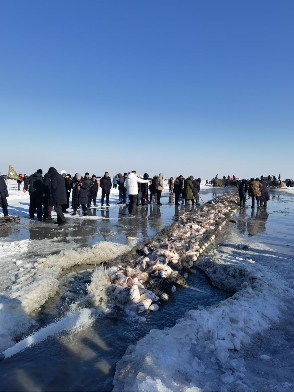 數九寒天,4匹健碩的馬拉著絞盤打轉,胖頭魚、鳙魚、草魚、鰱魚……漁網在冰上好似一條生產線上的傳送履帶,數萬尾鮮魚源源不斷地出湖,在冰湖上彈跳起舞。