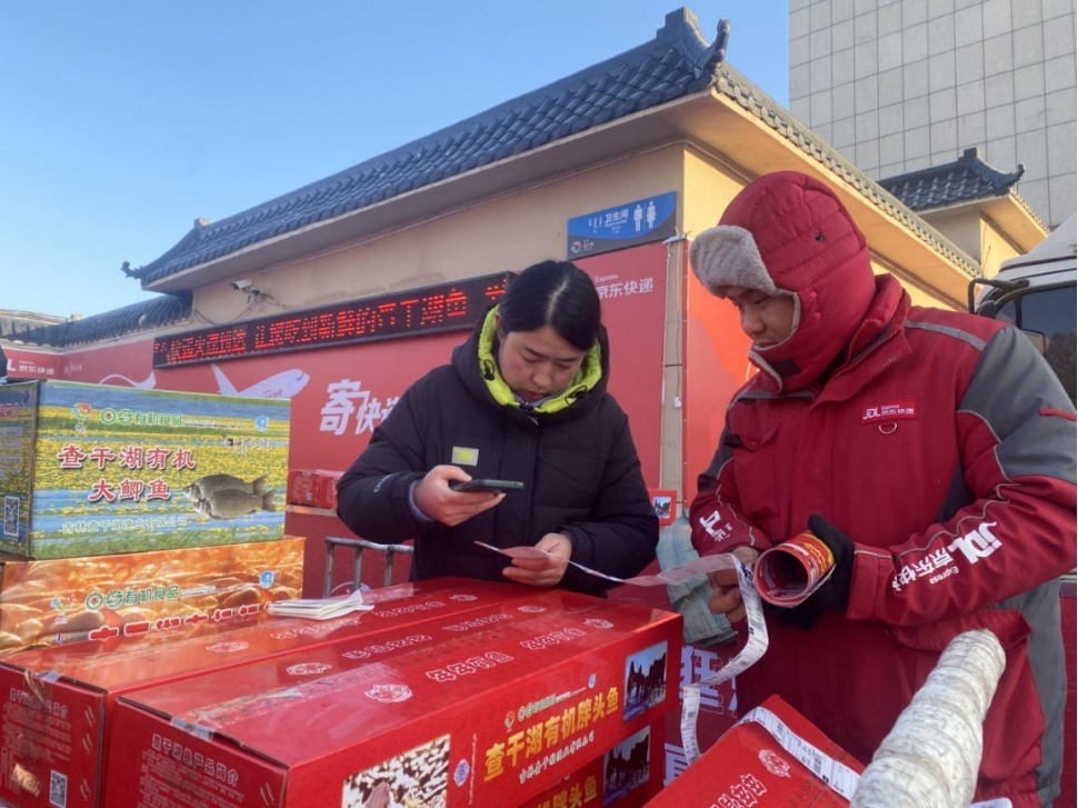 曲三妹領記者走到餐館一旁的空地上,農家樂的員工正在把一條條魚稱重、打包、裝箱,空地的一側已經密密麻麻摞著一大批查干湖胖頭魚的快遞箱,“現在冬捕剛剛開始,每天可以寄出幾十條大胖頭魚。按往年的經驗,再過一陣,每天得寄出幾百條魚呢。”曲三妹笑著說。“農家樂的生意紅火,周邊村屯的村民也受益。農閑之后正是冬捕季,村民可以在農家樂做服務員、打包湖魚,我們按每天120元給錢。”