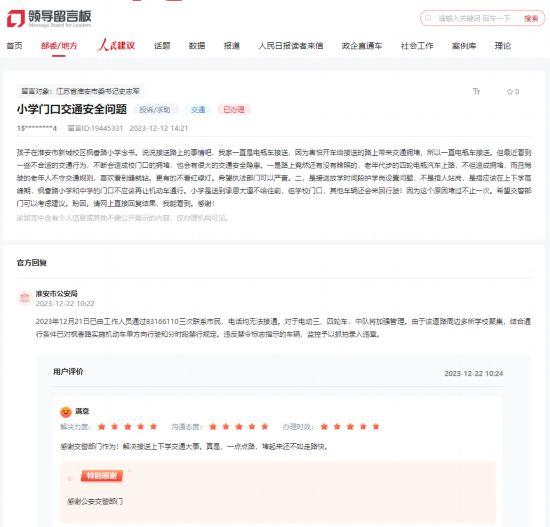 “在接送孩子上小學的路上,我發現仍有未上牌的老年代步車在行駛,駕駛的老年人也不守交通規則,看到縫就鉆,有的甚至不看紅綠燈。上下學高峰時段,各種車輛穿插亂行,學生的安全讓人擔憂。”收到群眾在“領導留言板”的留言后,江蘇省淮安市公安局對相關路段實施機動車單方向行駛和分時段禁行規定。違反禁令標志指示的車輛,監控予以抓拍錄入違章。“送孩子再也不用膽戰心驚了”,留言人對解決方案非常滿意:“感謝公安交警部門,解決了接送孩子上下學的交通大事。”