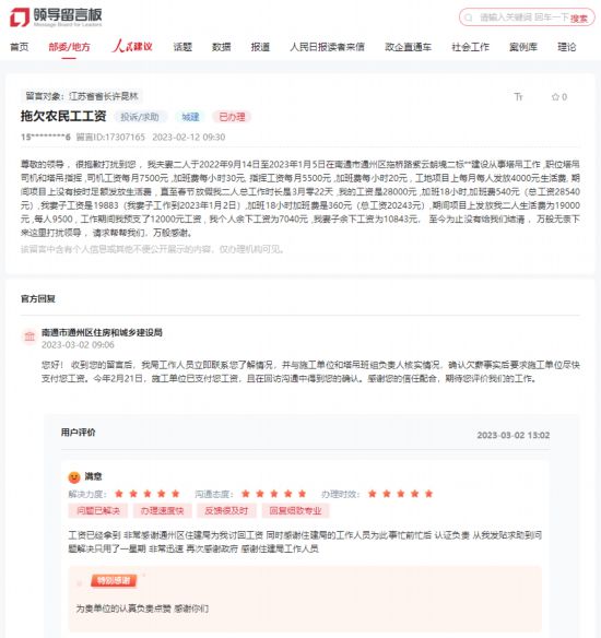2023年初,有群眾給江蘇省省長留言反映,其夫妻二人在一地產項目從事吊塔工作,被拖欠工資近兩萬元。南通市通州區住房和城鄉建設局核實欠薪事實后,要求施工單位盡快支付該群眾工資。2月21日,群眾確認已收到工資,并在評價中激動地表示,“工資已經拿到,非常感謝住建局為我討回工資,工作人員為此事忙前忙后,認真負責,從我發貼求助到問題解決只用了一星期,非常迅速,為貴單位的認真負責點贊!”