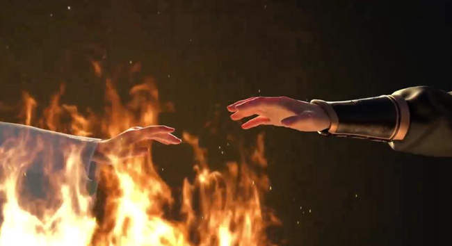 此時,通過特寫女主眼球里反射出的火山爆發鏡頭無縫銜接,轉場到初一與玄龍生死離別的場景。當鏡頭拉開旋轉到女主身后,天神初一已經站在火光之中。