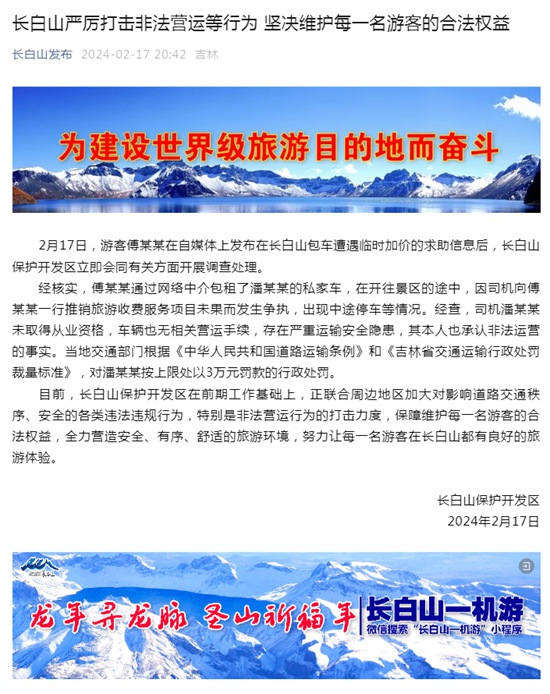 記者從長白山保護開發區了解到,2月17日,游客傅某某在自媒體上發布在長白山包車遭遇臨時加價的求助信息后,吉林文旅部門第一時間介入,長白山保護開發區立即會同有關方面開展調查處理,并對司機的違規行為進行行政處罰。