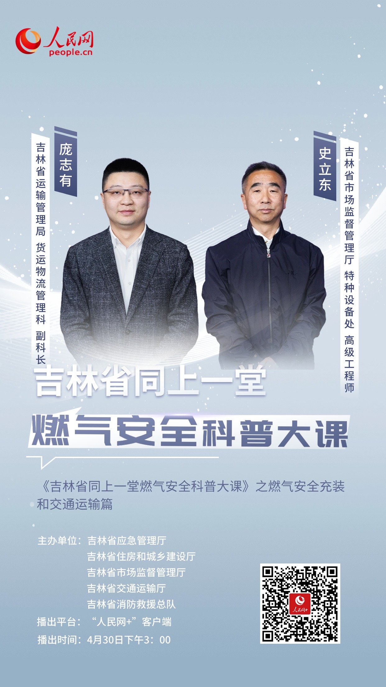 4月30日下午3:00,由吉林省應(yīng)急管理廳、吉林省住房和城鄉(xiāng)建設(shè)廳、吉林省市場監(jiān)督管理廳、吉林省交通運(yùn)輸廳和吉林省消防救援總隊(duì)共同主辦的《吉林省同上一堂燃?xì)獍踩破沾笳n》之燃?xì)獍踩溲b和交通運(yùn)輸篇開課,將在“人民網(wǎng)+”客戶端、人民網(wǎng)吉林微信視頻號(hào)、人民網(wǎng)吉林抖音號(hào)同步播出。