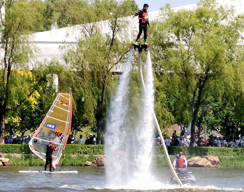 龍舟既是一項備受歡迎的傳統(tǒng)民俗活動,也是一項活力四射、昂揚向上的體育活動。在現(xiàn)場,除了精彩刺激的龍舟競賽,還有豐富多彩的全民健身展示和文化活動。全民健身活動展示覆蓋水上、陸上、空中,包括青少年OP帆船、帆板、摩托艇、水上飛人、槳板等項目。端午民俗體驗活動帶來五彩繩編織、香囊制作等,為市民提供了一場端午盛宴。