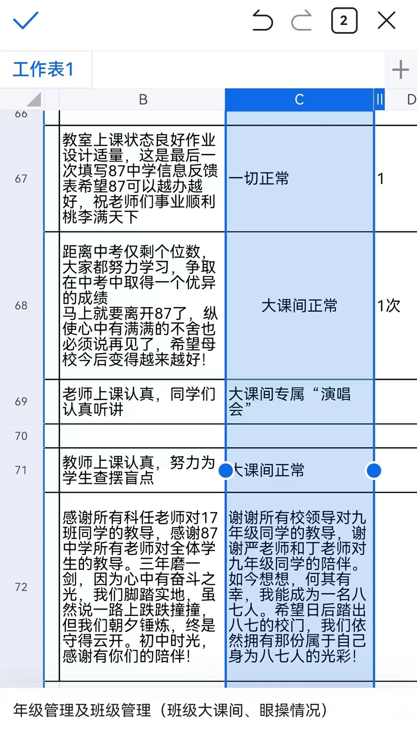 而在初三班級信息員遞交的班級管理表格上,不同班級的最后一條信息,不約而同地寫上了對學校和老師的感激,讓人淚目。