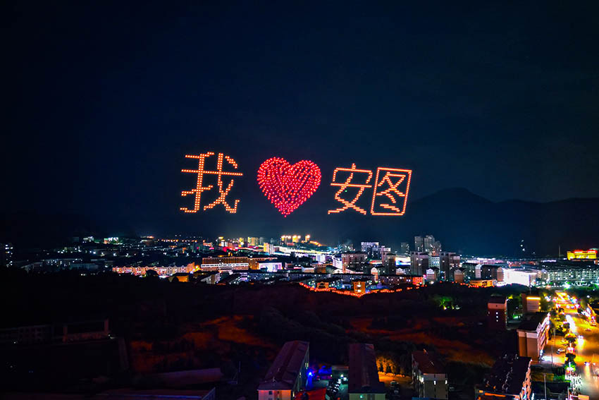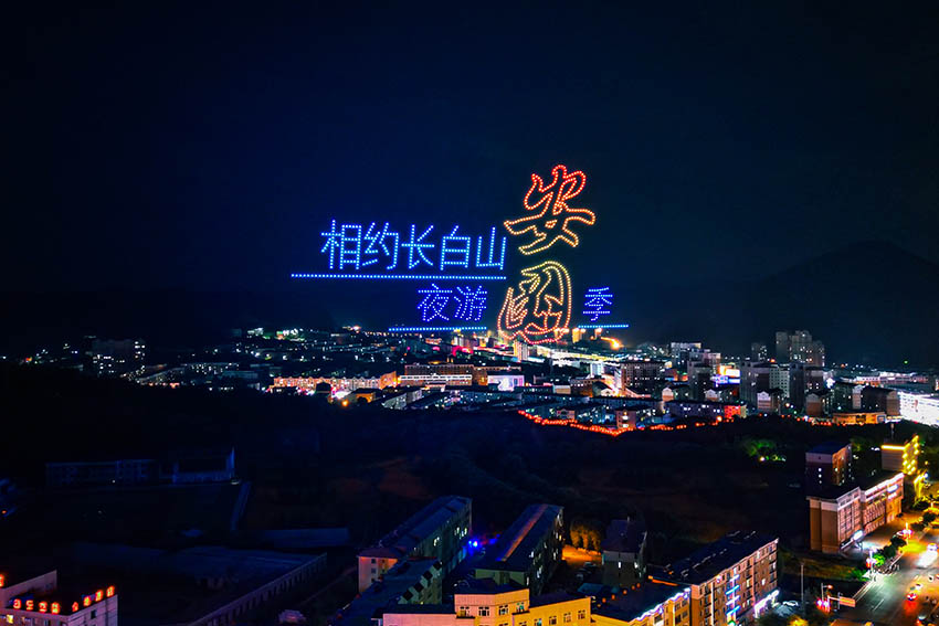 值得關注的是隨后進行的無人機表演,這是安圖首次大型無人機秀,1000架科技感十足的無人機閃爍著各色彩燈冉冉升起、懸停天幕,在夜空中不斷走位編隊、變換組合,以起落交錯的隊形、變幻絢麗的燈光,精美巧妙地描繪出“安圖縣徽”“我愛安圖”“長白山第一縣”“展翅飛翔的白鶴”“翱翔天際的巨龍”等圖案,排列出“相約長白山 夜游安圖季”“中華民族一家親”“同心共筑中國夢”“魅力安圖歡迎您”等字樣,形成了一幕幕精妙絕倫的立體畫面,將鑄牢中華民族共同體意識、龍的傳人、安圖城市韻味等一一生動呈現。現場觀眾紛紛舉起手機拍照、錄影,跟隨無人機的表演歡呼雀躍,欣賞這場科技與藝術相結合的“高空光影秀”,感受科技增添的濃厚喜慶氛圍,讓生活在這座城市的人們幸福倍增、信心倍增!
