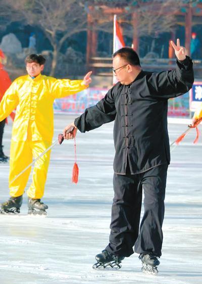 當我領銜80名滑冰者組成的方隊在冰面上,一齊劍隨體動,身隨步動,如行云流水般將冰上太極劍的整套動作精彩演繹后,獲得了現場觀眾和參賽者們的歡呼與贊嘆。自此,冰上太極劍作為承德市獨具地方特色的冰雪展示項目得以保留。