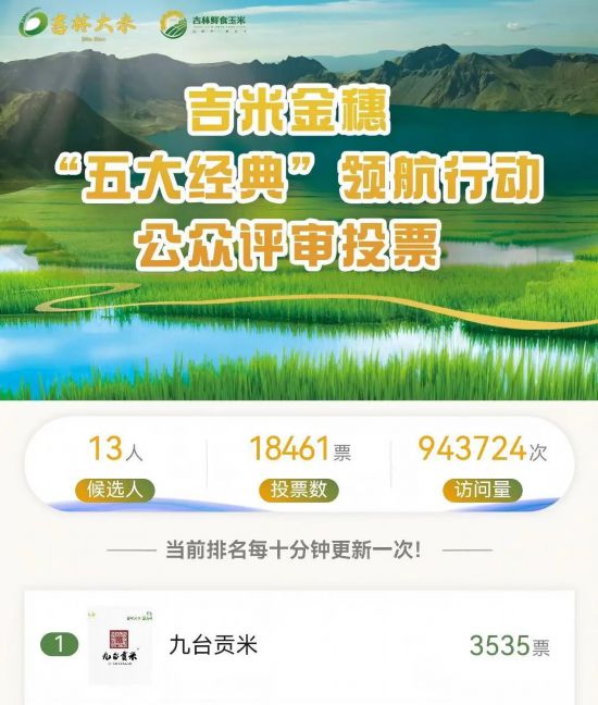 2025年,吉林省糧食和物資儲備局啟動金穗“五大經典”領航行動,聚焦打造“吉字號”糧食品牌集群,活動涵蓋“吉林大米十大地理標志品牌”“吉林鮮食玉米五大地理標志品牌”等五大類別評選,通過申報、初審、復審、公眾參與、專家評審、公示六大環節,全面挖掘糧食產業發展潛力。自5月啟動以來,活動得到全省各地糧儲部門與企業的積極響應,6月18日至22日集中投票期內——九臺貢米以超高人氣斬獲“吉林大米十大地理標志品牌”公眾投票第一名,成為“吉字號”大米品牌的耀眼標桿。