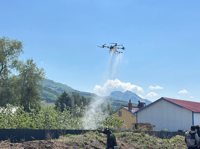 “我家有塊地沒有機耕路。今年夏天旱,果樹需要澆水。我先讓人走去地里,然后用無人機運水,一次可以運75公斤,省時省力。” 韓飛開心地說。