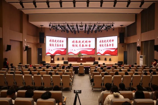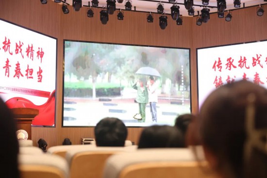 報告廳內座無虛席,肅穆與崇敬的氣息像暖潮般包裹著每一寸空間。大屏幕上,“傳承抗戰精神 鑄就青春擔當” 十二個鮮紅大字熠熠生輝,宛如一盞明燈,時刻提醒著在場師生:歷史從不是書本上冰冷的文字,而是由無數熱血生命書寫的滾燙篇章。活動開始前半小時,報告廳的入口便排起了長隊。學生們或手捧筆記本,專注翻閱著抗戰史料,筆尖不時在關鍵處勾畫;或圍在一起輕聲交流,年輕的眼眸里滿是對老戰士的期待與對歷史的敬畏,那份純粹的向往,讓整個空間都變得格外莊重。