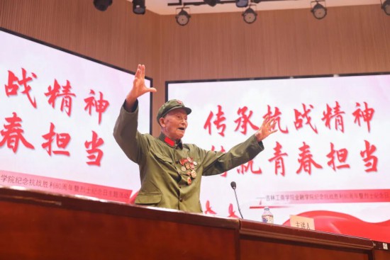“雄赳赳,氣昂昂,跨過鴨綠江……”激昂的旋律在吉林工商學院博學樓A區117報告廳內回蕩,94歲的抗美援朝老戰士楊秀友緩緩站定。他的脊背雖不復當年挺拔,沙啞的嗓音卻裹挾著穿透歲月的力量,將這首鐫刻著烽火記憶的軍歌,唱進在場每一個人的心里。9月26日上午,數百名金融學院師生自發起身,指尖跟著旋律輕打節拍,輕聲合唱與熱烈掌聲交織,時光仿佛在這一刻折疊——年輕的面龐與戰火中的青春隔空相望,一段厚重的歷史,以最動人的方式完成了跨越時空的對話。