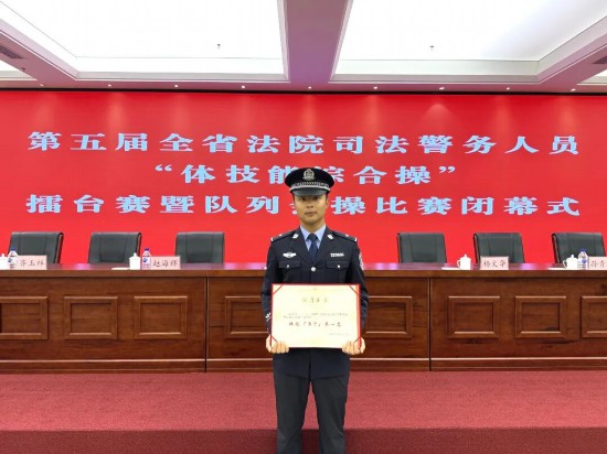 凈月法院干警蔣超與全市各法院選拔出的優秀警員組成的隊列班,經過無數次的動作糾正、幾百小時的協同訓練磨合,最終,以準確嘹亮的口令、整齊劃一的動作、昂揚飽滿的氣勢贏得全場掌聲與喝彩,以壓倒性優勢領跑全省,獲得團體一等獎。