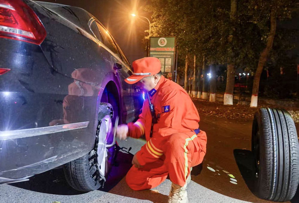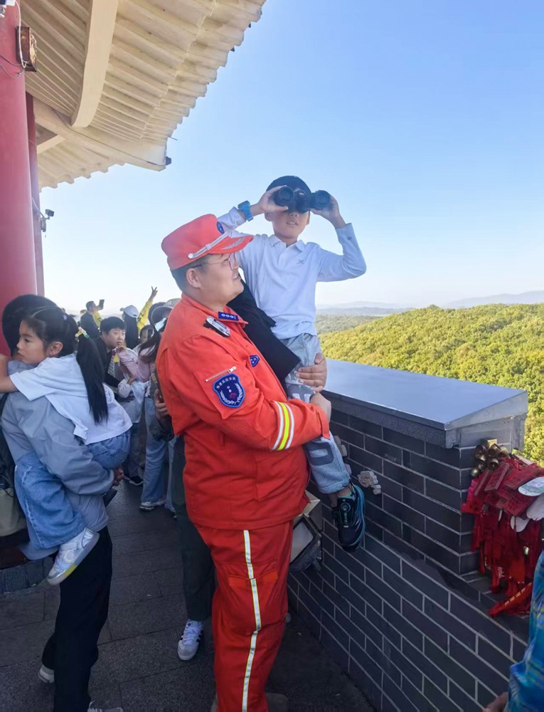 溫情故事在林間不斷上演。一位防火隊(duì)員正伸出手臂,為幾位游客指引遠(yuǎn)方的風(fēng)景,并詳細(xì)講解著景點(diǎn)的歷史和特色。他們目光所及,是吉林秋日的壯美山河和豐富文化。在觀景平臺(tái),另一位防火隊(duì)員主動(dòng)接過游客的手機(jī),幫忙拍下與家人的珍貴合影,身后的警示牌“禁止倚靠”也成了無(wú)聲的安全提醒。還有一位防火隊(duì)員抱起一個(gè)小朋友,并把手中的望遠(yuǎn)鏡遞給他,助力孩子“登高望遠(yuǎn)”。更有幾位防火隊(duì)員為爆胎車輛,以最快速度更換了輪胎,得到了車主的連連稱贊。
