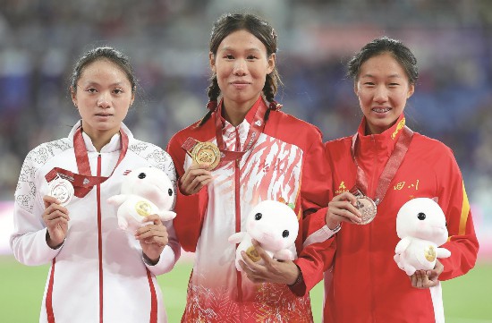 11月20日,在第十五屆全運會田徑女子1500米決賽中,吉林名將李春輝以4分06秒28的佳績奪得金牌。圖為李春輝(中)在領獎臺上。(記者張政 張寬 姚思琦 攝)