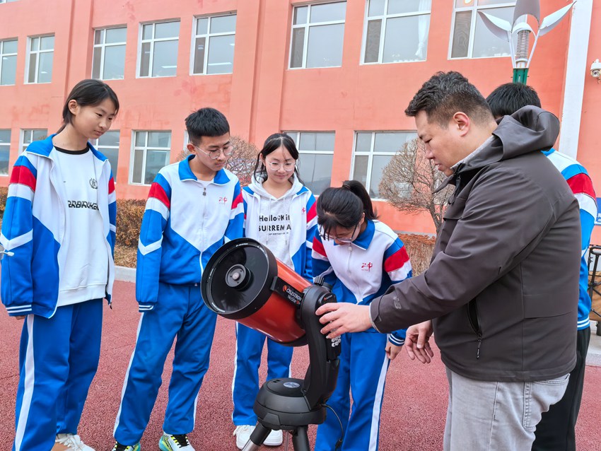 同樣沉浸在科普濃厚氛圍里的,還有輝南二中的同學們,大家爭先恐后通過天文望遠鏡探索太陽的奧秘。天文科普專家楊治國、鄒洪瑤帶領50余名青少年學生走進星空世界,教室內天文知識講座與戶外觀測實操相結合,點燃了鄉村孩子探索宇宙的科學夢想。