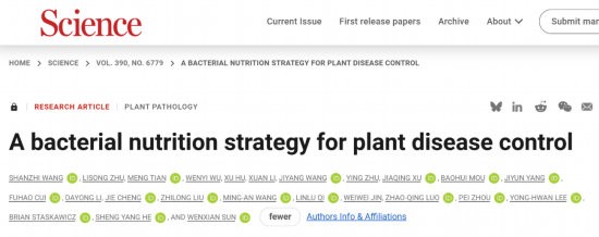 2025年12月19日,吉林農業大學孫文獻團隊、西南大學王善之團隊與杜克大學Sheng Yang He院士團隊合作在國際頂級學術期刊Science上發表題為“A bacterial nutrition strategy for plant disease control”的研究論文。該研究揭示了水稻細菌性條斑病菌在寄主細胞合成一種新型磷酸糖酯化合物 “黃單胞糖”作為專用營養,供給細菌增殖的獨特營養獲取機制;基于此研究,開創了“抗黃單胞糖”的生物育種策略,為防治多種重要作物細菌性病害提供了新途徑。