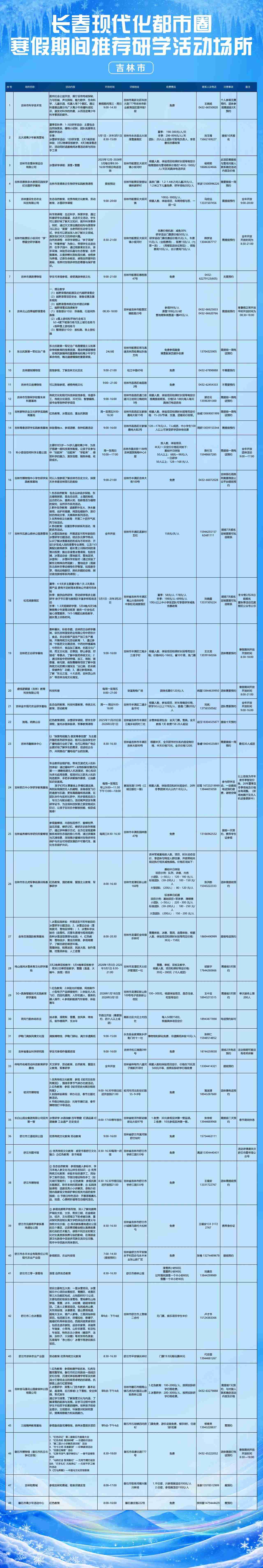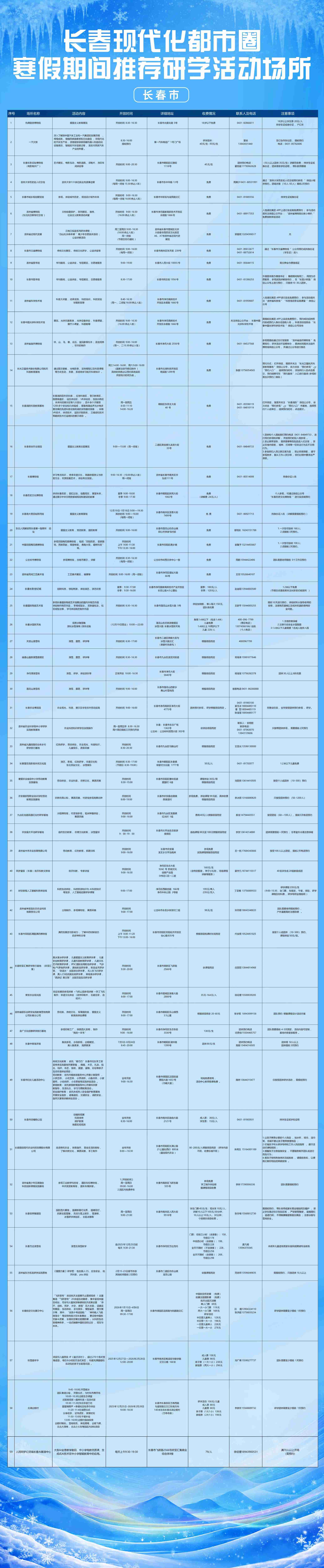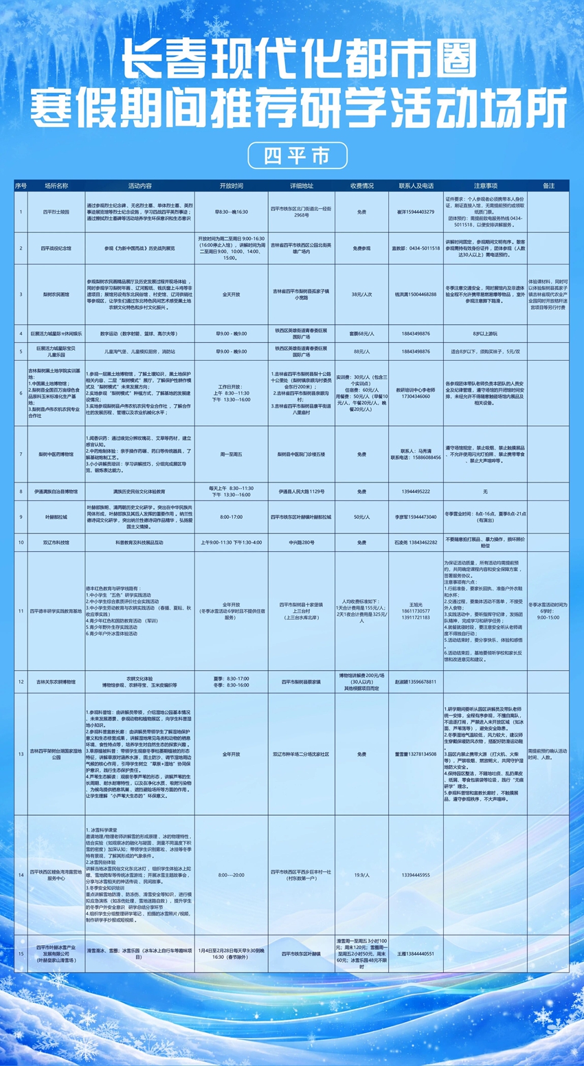 為豐富學生寒假生活,促進學生全面發展,長春市、吉林市、四平市、遼源市四地教育部門整合現代化都市圈優質資源,遴選并推薦135個寒假期間研學活動場所,為學生提供更多研學實踐的平臺和選擇,希望廣大學生積極參與、親身體驗,在實踐中感悟,在研學中成長。
